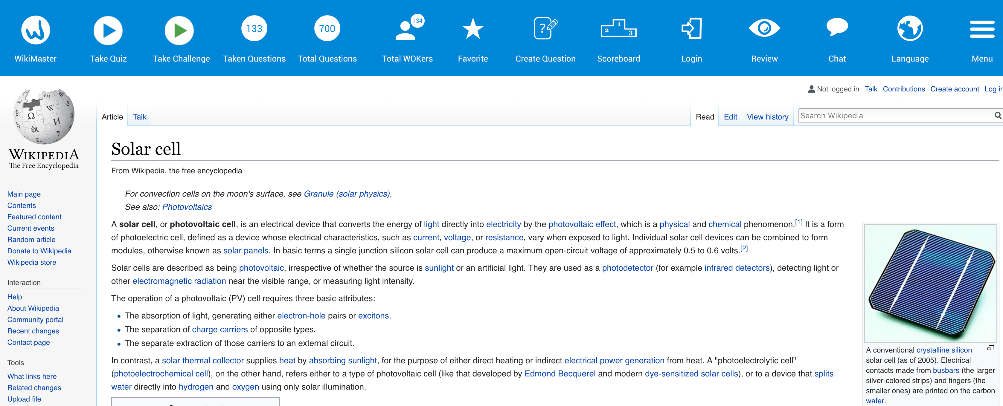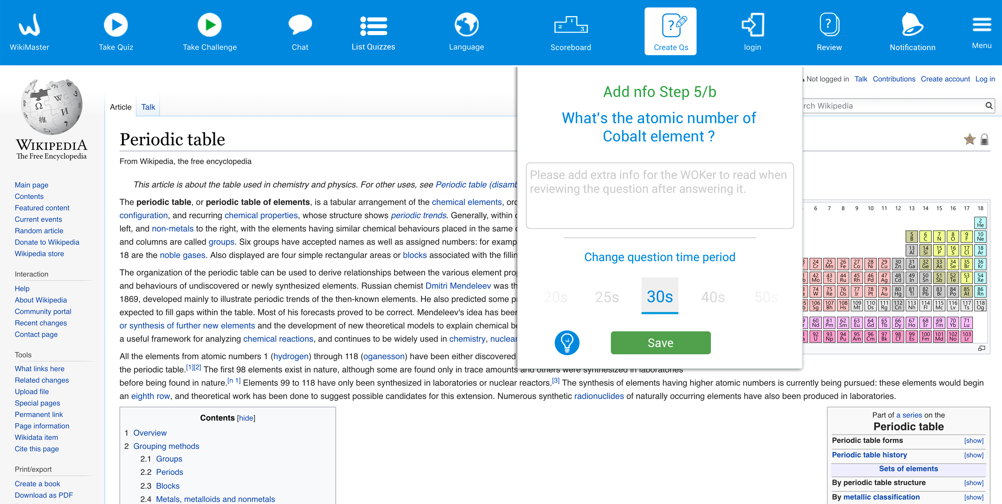 With WOK working as a cousin outside the WMF: We now started with WikiMaster the web version of WikiMaster adding quizzes and validation for national exams like SAT into the Wikipedia World.